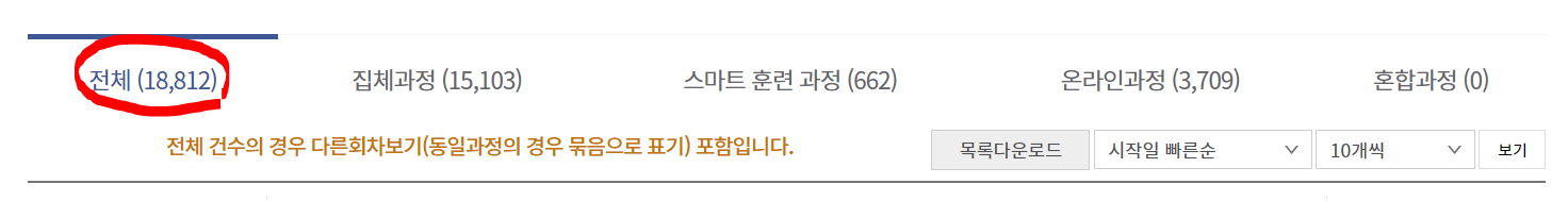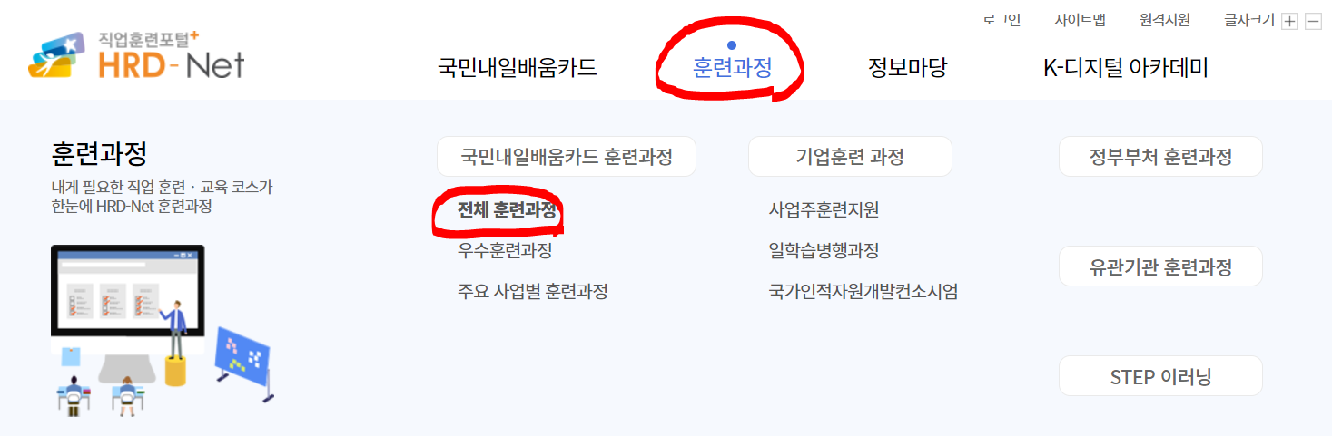 먼저, 직업훈련 포털 사이트(HRD-Net) 접속하십니다. 접속하신 후 위 배너에서 훈련과정 → 전체훈련과정을 들어가 주세요.