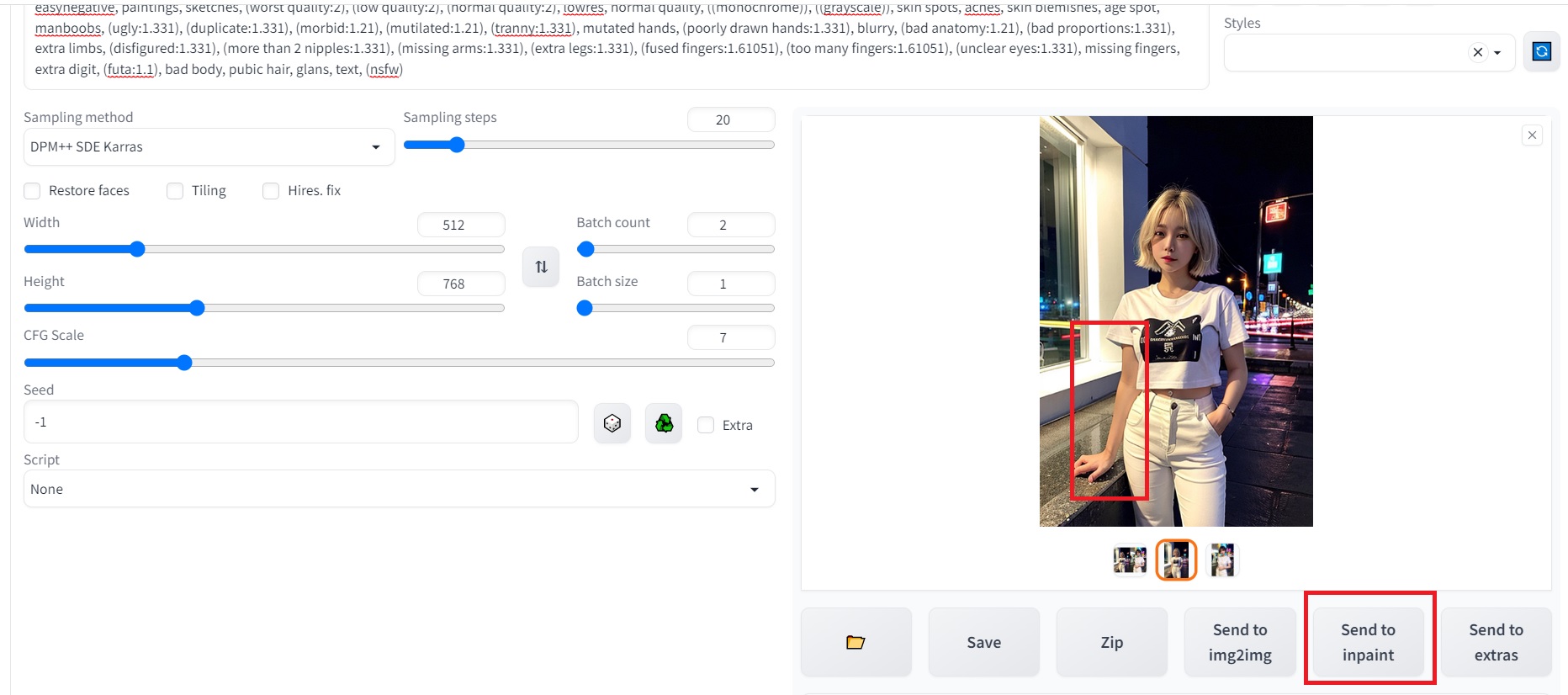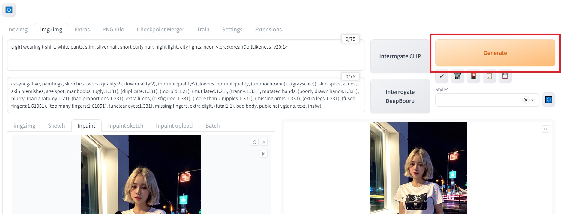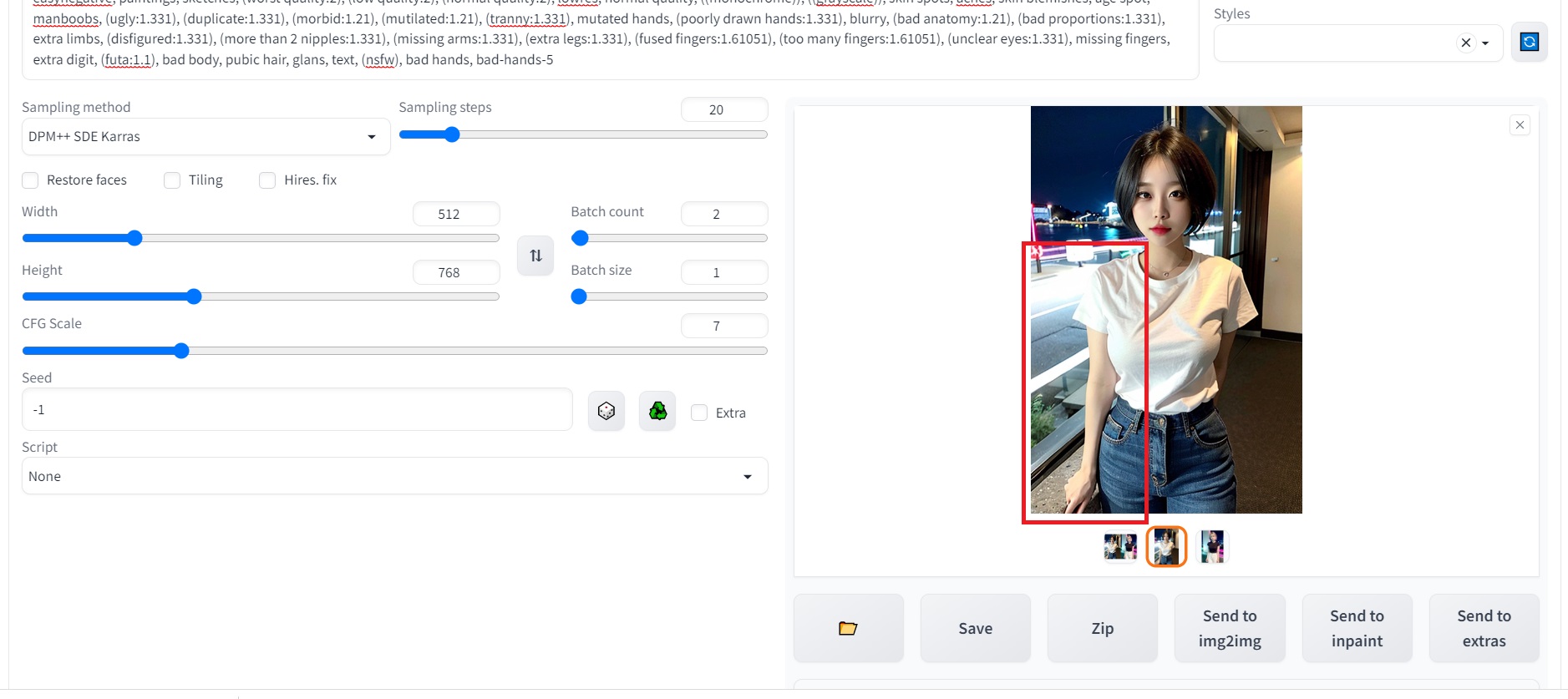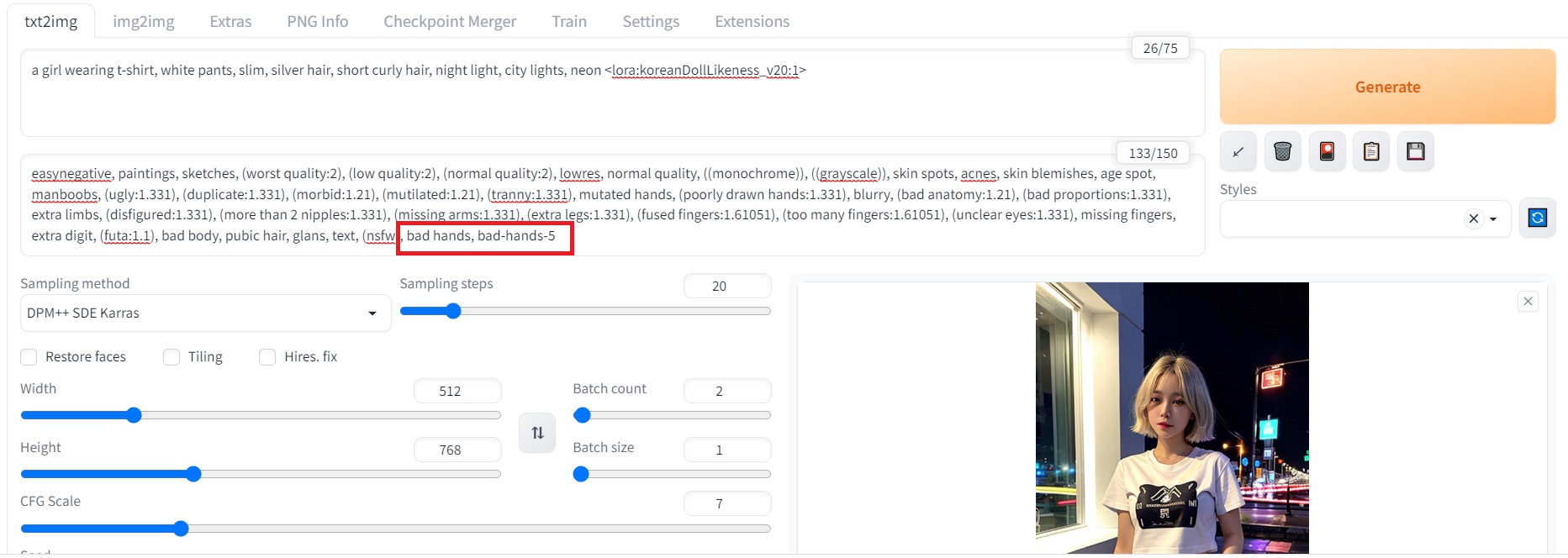 위의 사진과 같이 부정프롬프트에 bad hands, bad-hands-5를 넣어주시면 되고요.