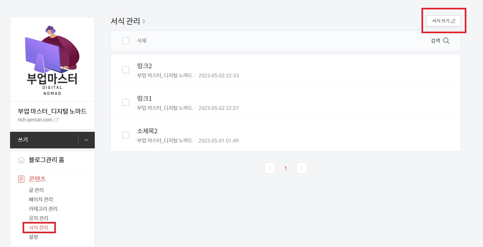 1. 티스토리 블로그 관리 > 콘텐츠 > 서식관리 메뉴 > 서식 쓰기를 클릭합니다.
