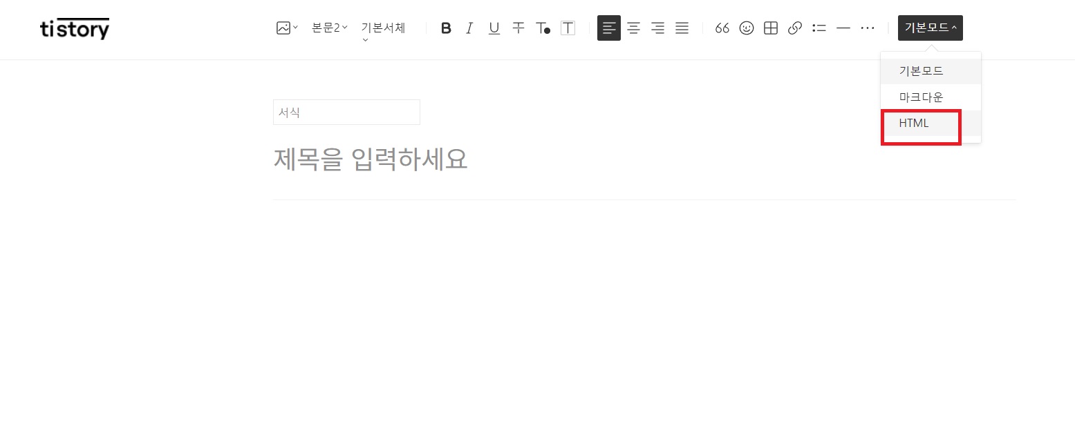 2. 클릭 후 기본모드를 HTML 모드로 변경합니다.