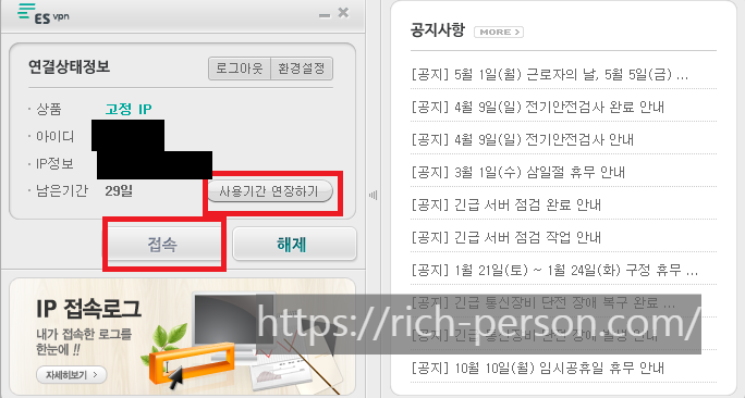 계속 쓰시려면 ESVPN 프로그램 실행후에 접속 버튼을 누른 채로 창은 끄지 않아야 한다는 것. 꼭 명심하세요!!