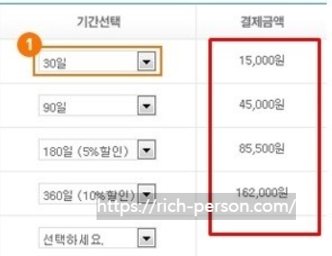 클릭하셨으면 위와 같은 결재창이 나옵니다. 30일, 90일, 180일, 360일 중에서 선택해줍니다.