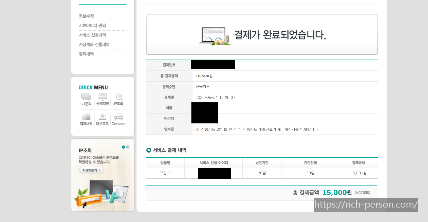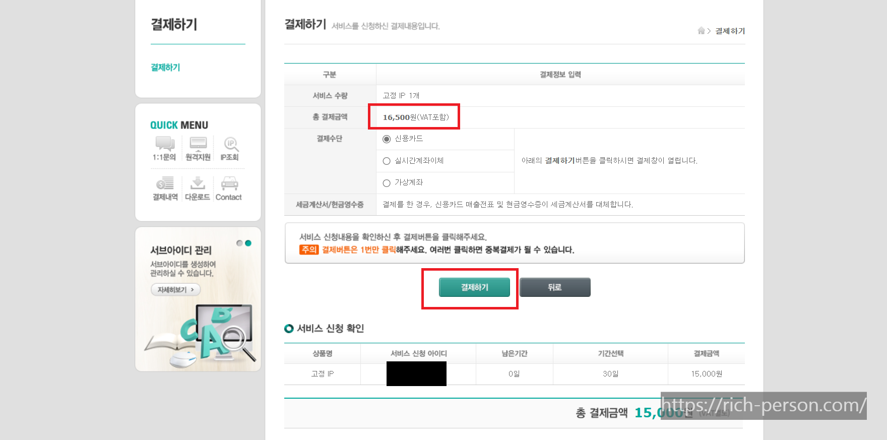 사용기간 연장하기를 까먹고 기간 만료시 기존에 사용한 고정 아이피는 다시 사용 못한다는 점 꼭 기억해주세요!