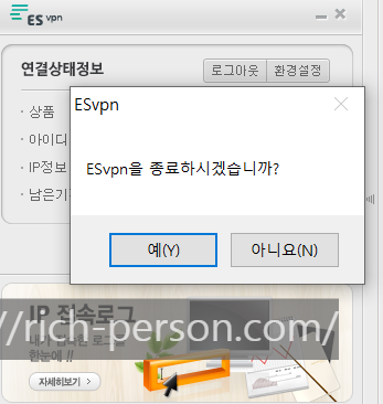 이렇게 ESvpn 프로그램 창을 닫기 위해 끌 수 있는데요. 끄게 되면 바로 유동 아이피로 바뀐다는 거 잊지 말아야 합니다.